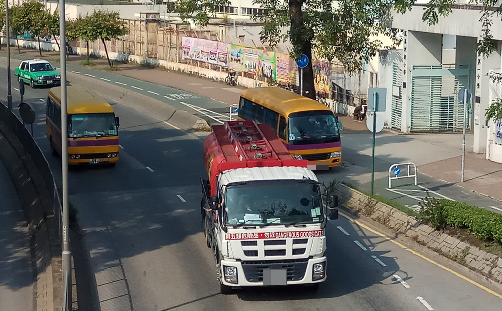 图:有运油车驶经上水凤溪第一小学门外,并与两辆校车“擦肩而过”