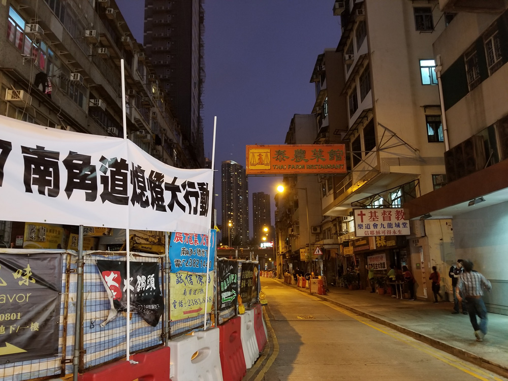 图:九龙城南角道商户,昨晚联合熄灯一小时,抗议沙中线工程地盘封路足足六年,影响商户生计