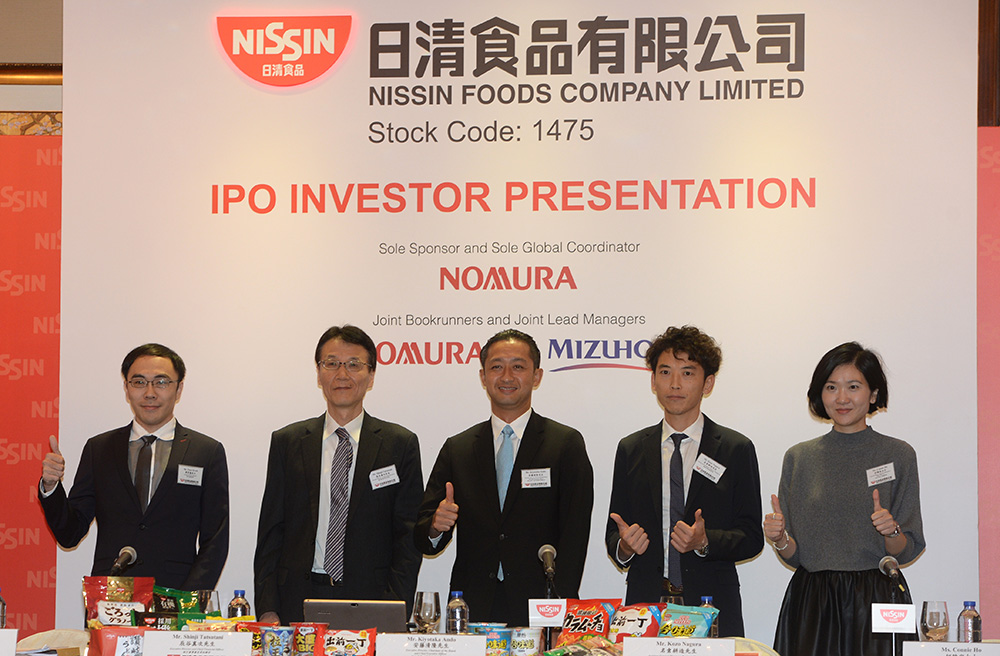 图:左起:日清食品投资者关系经理郭彦勤、首席财务官辰谷真次、首席执行官安腾清隆、经营管理助理总经理名仓耕造、经营企划及公关总经理何雅宜 大公报记者林良坚摄