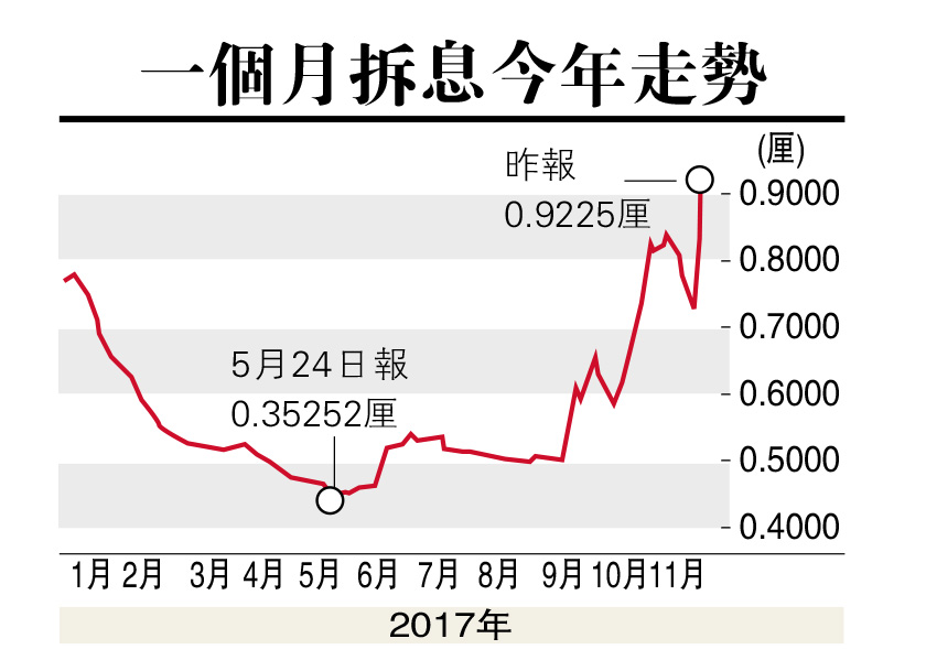 上海商业银行研究部主管林俊泓指出,到12月,港元与美元的息差一般倾向收窄,加上美联储料于下月再加息,届时一个月Hibor或升穿一厘,短期内料持续高企。