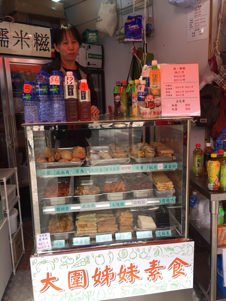 图:大围港铁站村南道出口对面的“大围姊妹素食”,主打街坊生意,可找到美味的芝麻卷