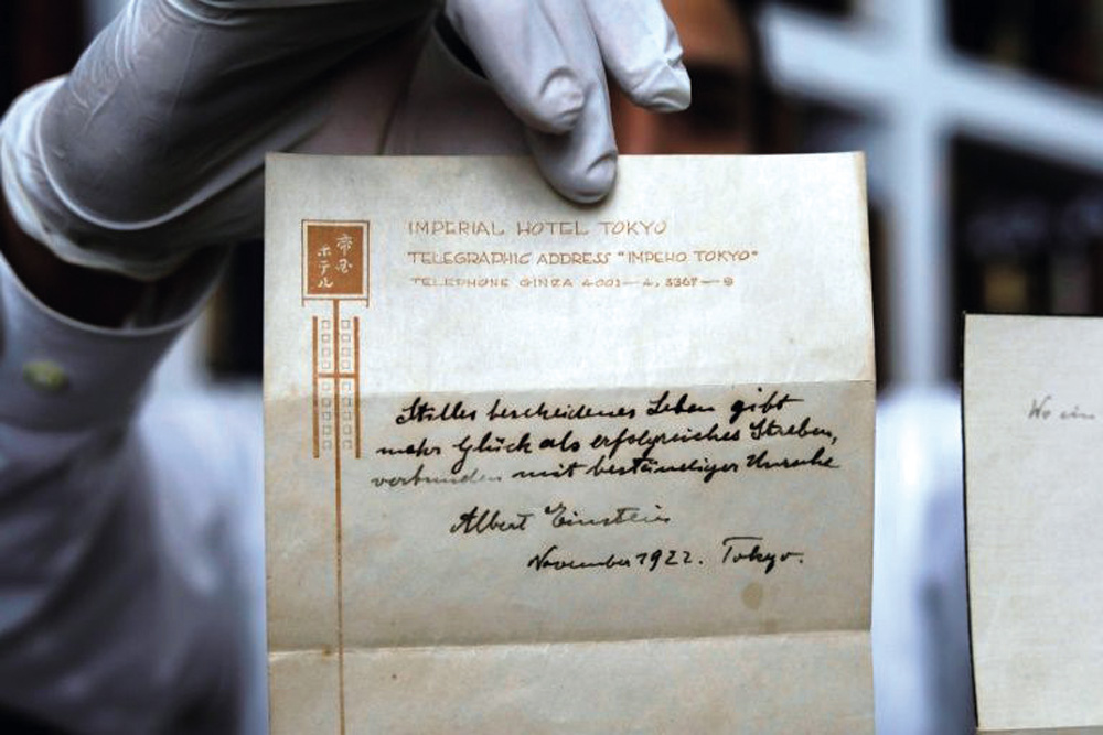 近日报载,物理学家爱因斯坦九十五年前在东京写下对快乐生活看法的字条,在以色列一个拍卖会,以一百五十六万美元高价卖出。事因一九二二年他前往东京演讲,当时一名信差到他的酒店给他送信,他刚被通知获颁诺贝尔物理学奖;因手上没零钱给小费,他就用纸写了两张字条给信差,一张写着“恬静简朴的生活比追求成功更为快乐”,纸条以一百五十六万美元卖出,另一张写着“有志者,事竟成”也以二十四万美元卖出。