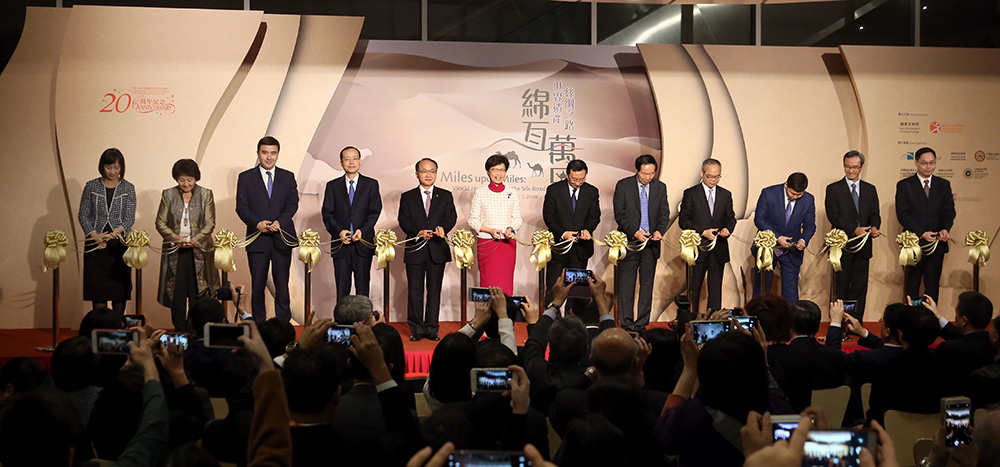 由国家文物局和康文署联合举办的“绵亘万里——世界遗产丝绸之路”大型展览,昨日于歷史博物馆盛大开幕,林郑月娥与国家文化部部长雒树刚、中联办主任王志民、国家文物局局长刘玉珠、中联办副主任杨健、民政事务局局长刘江华等担任主礼嘉宾,为展览剪綵。