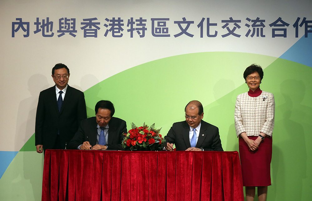 政务司司长张建宗与民政事务局局长刘江华,昨日在歷史博物馆,先后与国家文物局局长刘玉珠签署两项文化合作协议,包括《内地与香港特区深化更紧密文化关系安排协议书》及《关于文化遗产领域交流与合作更紧密安排协议书》,在加强两地专业人员的联繫和交流、文化遗产保护等方面合作全面深化,促进共同发展。