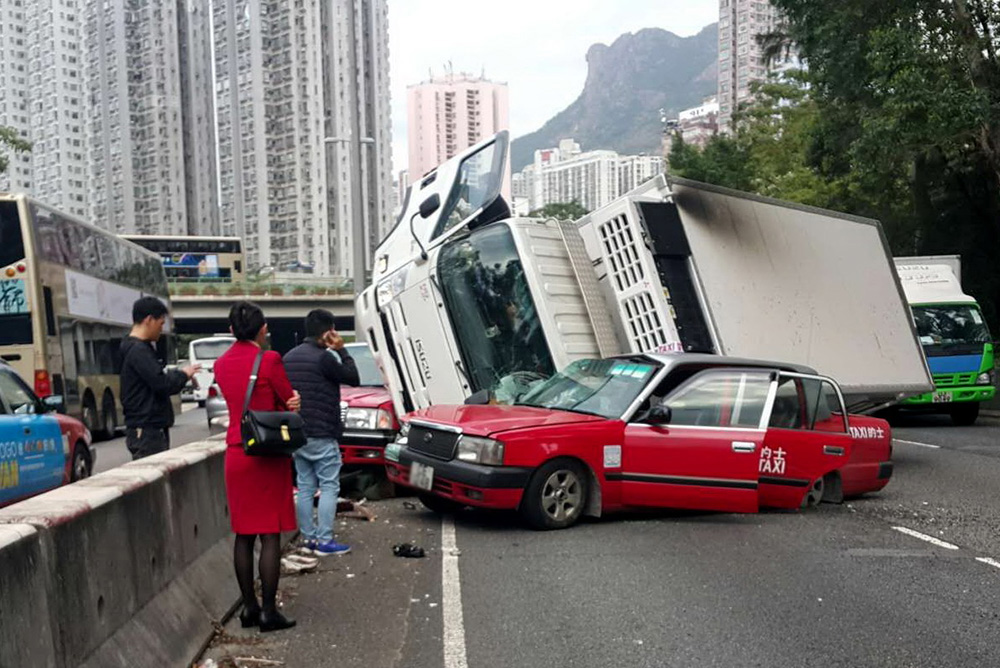 图:龙翔道一架货车翻侧压向的士,空姐逃过死劫,离开车厢于路旁待救