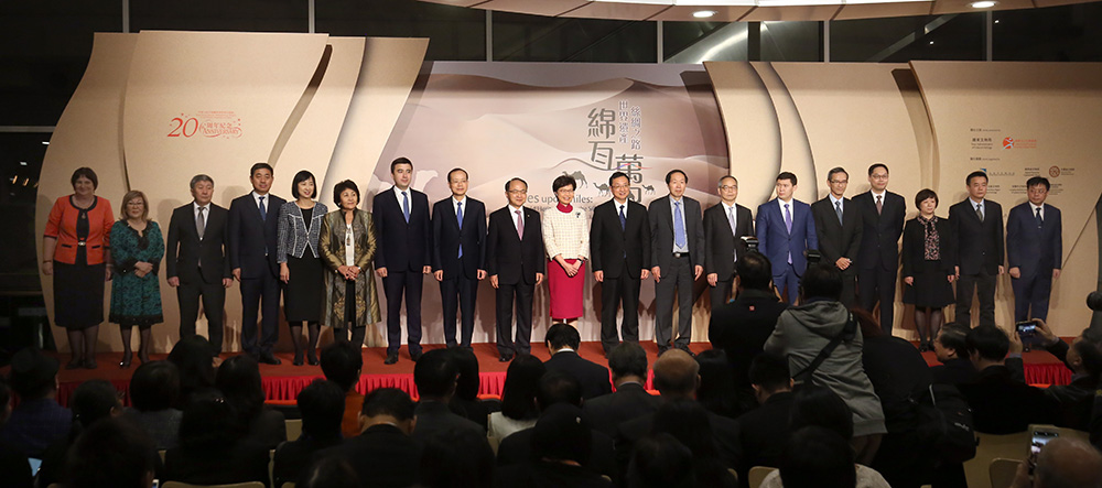 图:由国家文物局和香港特区政府康文署联合举办的“绵亘万里│世界遗产丝绸之路”大型展览昨日于香港歷史博物馆盛大开幕,图为林郑月娥与国家文化部部长雒树刚、中联办主任王志民、国家文物局局长刘玉珠等主礼嘉宾大合照 大公报记者黄洋港摄