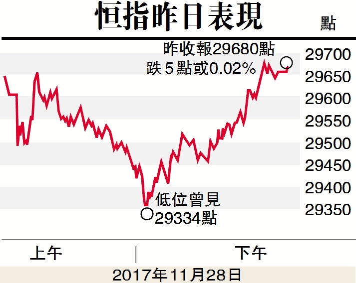 大市昨日低开低走,午后跌势加急,最多跌351点,或1.1%;继后A股V弹,恒指得以有喘定机会,收市时微跌5点,报29680点。国企指数则跌66点,报11705点。资金在早市大撤退,令全日成交额增加16%至1188亿元。由于大市主要靠指数权重股支撑,所以全日下跌股份多达1004隻,上升股份数目603隻。
