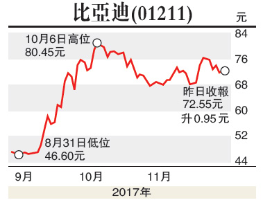 随着新能源汽车的相关政策如“双积分制度”等陆续出台,市场佔比高达20%的比亚迪定能大幅受惠,加上集团手机 部件及充电电池业务均逐步加速,比亚迪未来发展空间值得憧憬。集团股价9月开始急速上升,短短一个月由50元(港币,下同)升至83.7元,随后逐步回调,建议于70元买入,目标价82元,失守67元则先行离场。