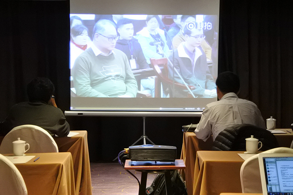 图:部分媒体在岳阳大酒店会议室看微博转播李明哲案宣判 中央社