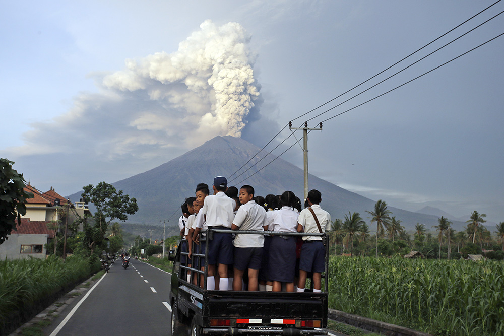 图:峇里岛上的学生因火山喷发停课,并被撤离出危险地带 美联社