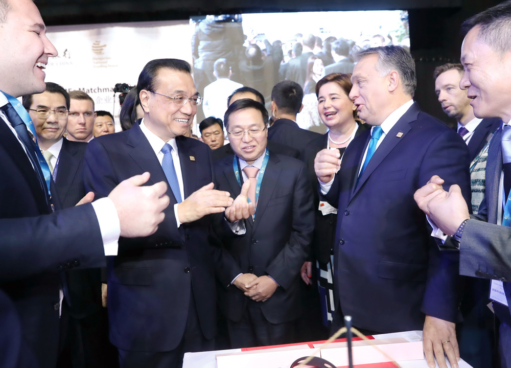 图:27日,中国国务院总理李克强与匈牙利总理欧尔班参观“16+1”中小企业合作对接会成果展并同企业家们亲切互动交流 新华社