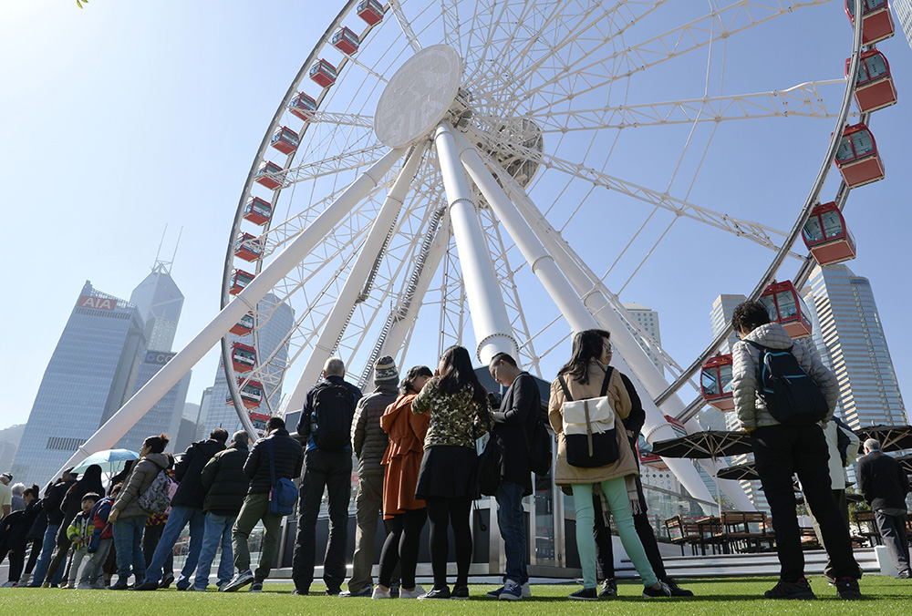 ▲携程报告显示,元旦小长假期间,45%的内地游客选择出境游,香港成为首选目的地。图为12月20日,游客排队乘坐摩天轮 中通社
