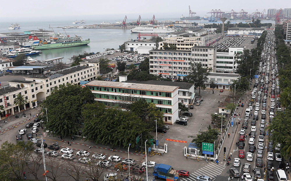 近期大雾频现导致琼州海峡停航。截至20日上午8时,准备通过琼州海峡出岛过海车辆已滞留超一万辆,周边多个路段拥堵严重。图为20日,大量过海车辆在海口秀英港等待过海。 (新华社)