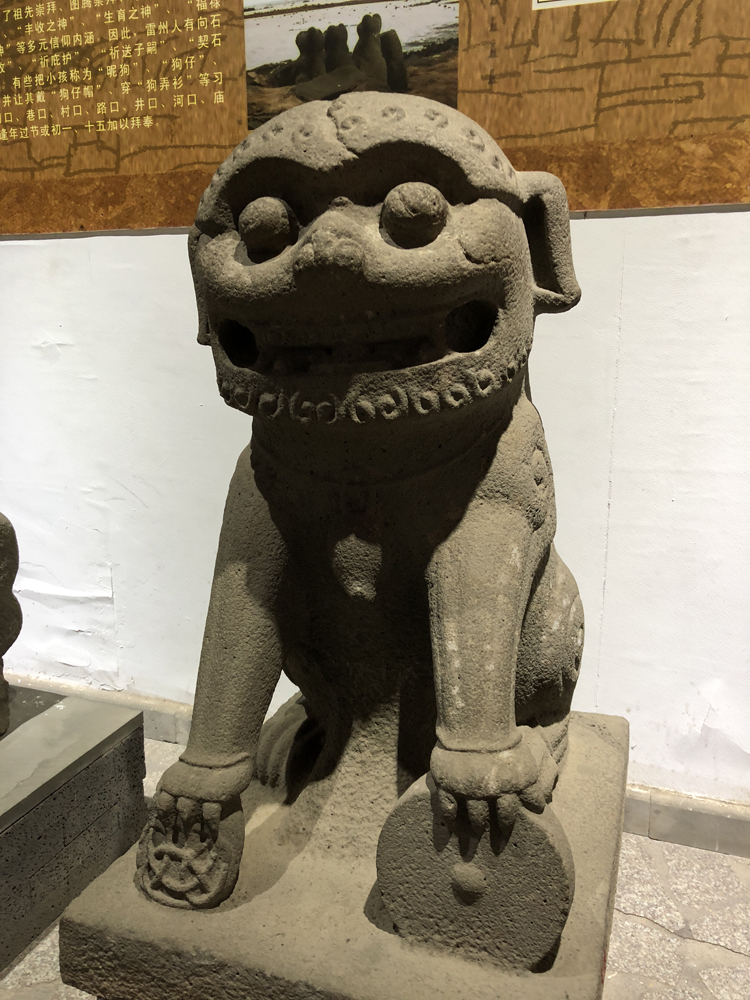 雷州境内现存的古石狗约有二万隻左右,年代较早的石狗是南北朝时期古雷州州治旧址附近“石狗坡”的石狗,距今约有一千四百多年。目前,仅湛江、雷州等地博物馆收集到的石狗已有一千多隻。它们大小不等,有的咧嘴含笑,有的憨态可掬,有的面目狰狞,有的鼻大耳肥,或坐、或蹲、或伏,形态各异,年代久远,世界绝无仅有。雷州石狗是土著文化、楚越文化、闽南文化、海洋文化、中原文化交融发展的见证,记载了雷州的歷史发展轨迹,在2007年12月,“石雕. 雷州石狗”纳入国家级非物质文化遗产代表作名录。