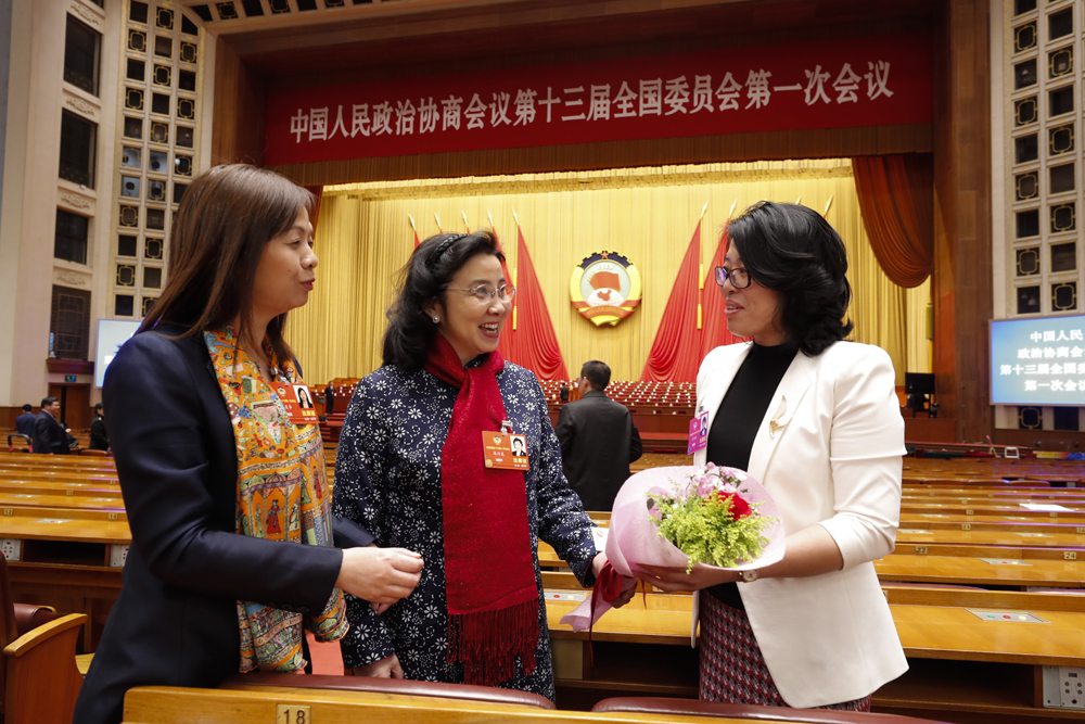 图:王美华委员、冯丹龙委员与收到鲜花的王伟明委员(由左至右)在全国政协十三届一次会议后讨论交流 /中新社