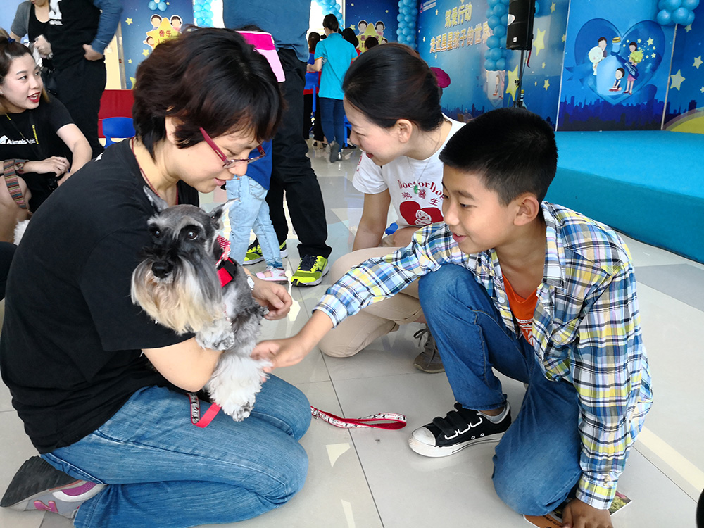 当天,共有近10隻“狗医生”来到活动现场与自闭症患儿互动交流,用特别的方式打开他们的心灵之窗。这是亚洲动物基金一项创新性的动物辅助治疗项目,让经过严格考试和训练的“狗医生”志愿者探访有需要的人,带去温暖。
