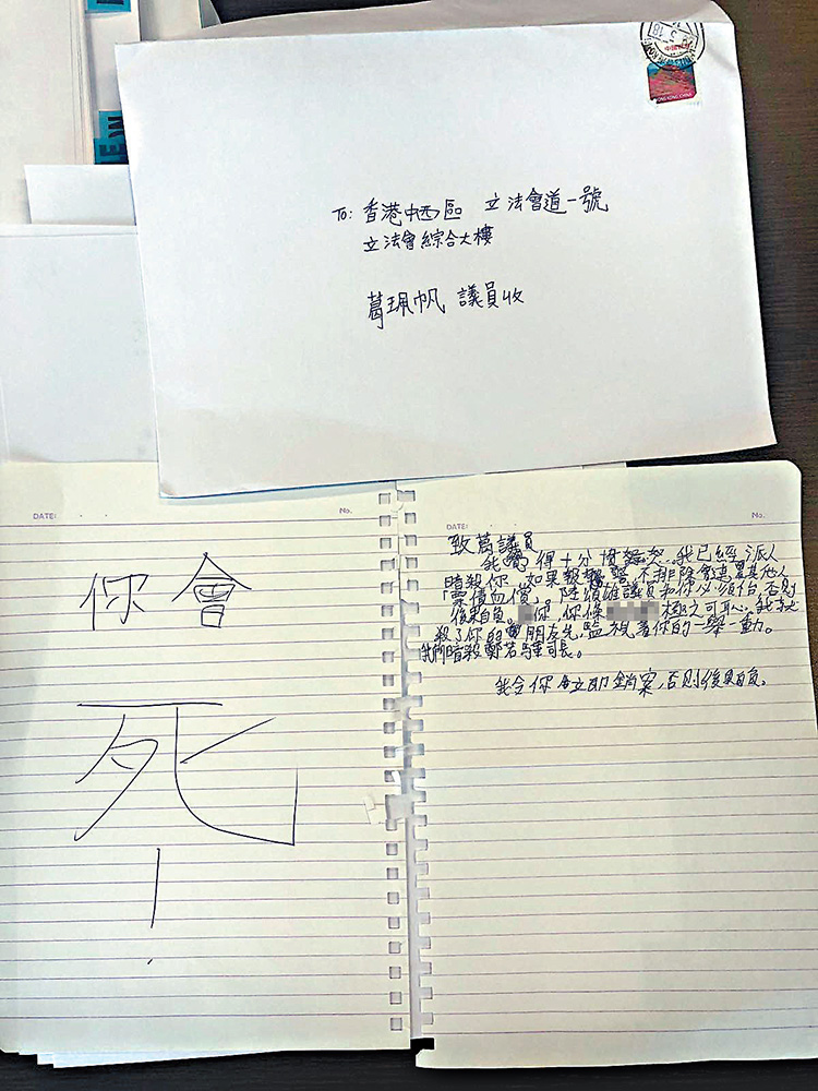 图:继上周的日文恐吓信事件之后,昨日再有死亡恐吓信寄到立法会议员葛珮帆的办事处。该信从香港寄出,其中一页用歪扭笔迹写着“你会死!”