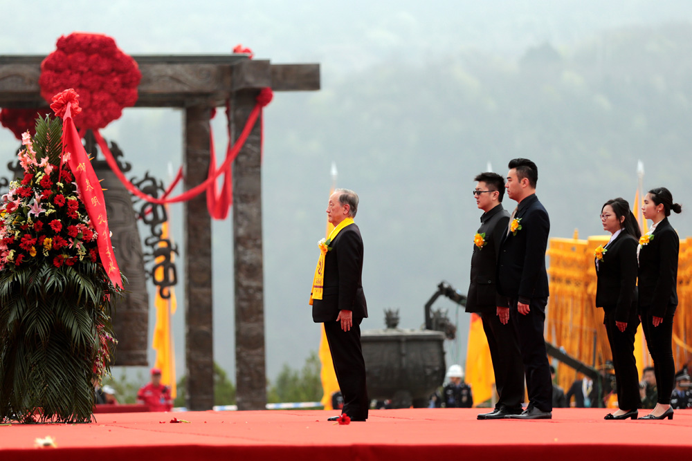 戊戌年清明公祭轩辕黄帝典礼5日在陕西黄陵举行。万馀名海内外中华儿女齐聚黄帝陵轩辕殿祭祀广场,共同祭奠中华民族的人文始祖轩辕黄帝。图为台湾新党主席郁慕明率领台湾青年敬献花篮