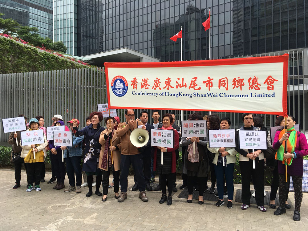 图:香港广东汕尾市同乡总会数十人,昨日到政府总部示威,抗议非法“佔中”发起人、港大法律学院副教授戴耀廷公然分裂国家的言行,要求政府严肃正视,港大亦应革除其教席