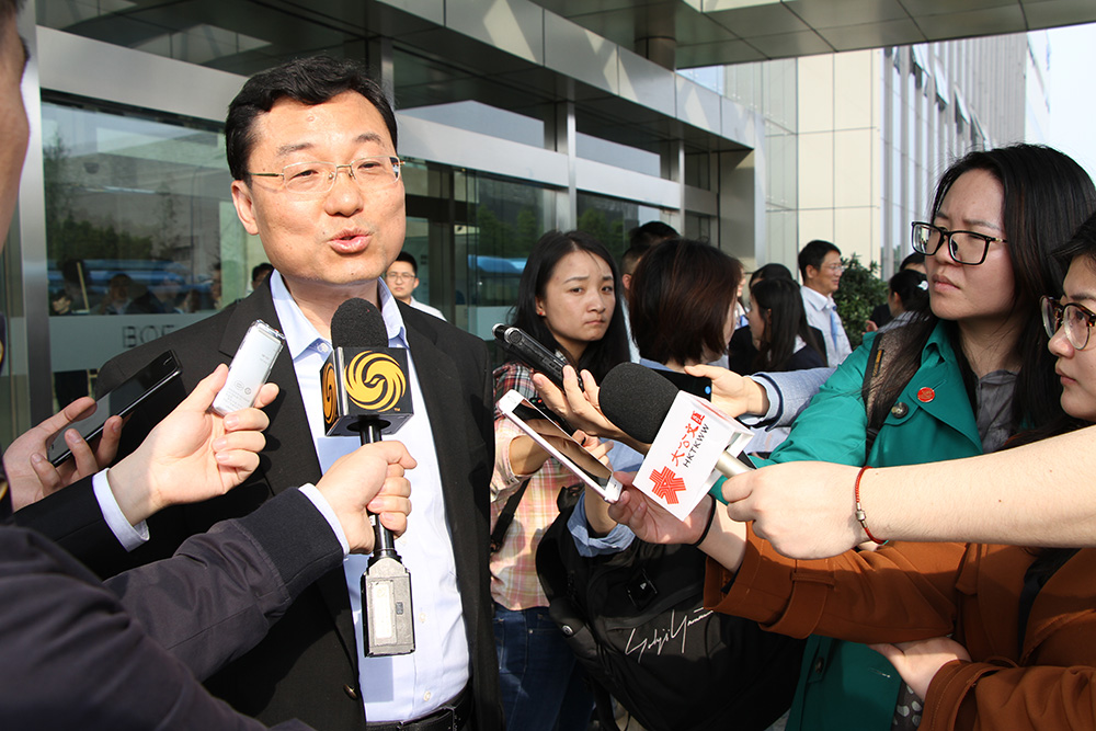 图:外交公署特派员谢锋在京东方高科技企业门前接受採访/大公报记者李兵摄