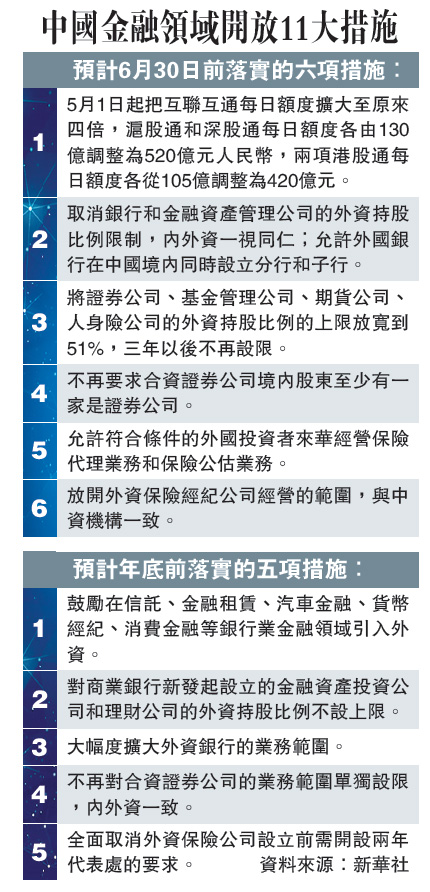兴业银行兼华福证券首席经济学家鲁政委认为,易纲的讲话明确了中国推进金融领域开放的三大原则,即“准入前国民待遇和负面清单”、“金融业对外开放将与汇率形成机制改革和资本项目可兑换进程相互配合共同推进”,以及“在开放的同时,重视防范金融风险,使金融监管能力与金融开放度相匹配”。鲁政委相信,今年中国金融领域开放将分两步走,第一步是在未来几个月大部分到位的6项开放措施,第二步是今年底前推出的5项开放措施,此外还包括争取在今年内开通“沪伦通”。