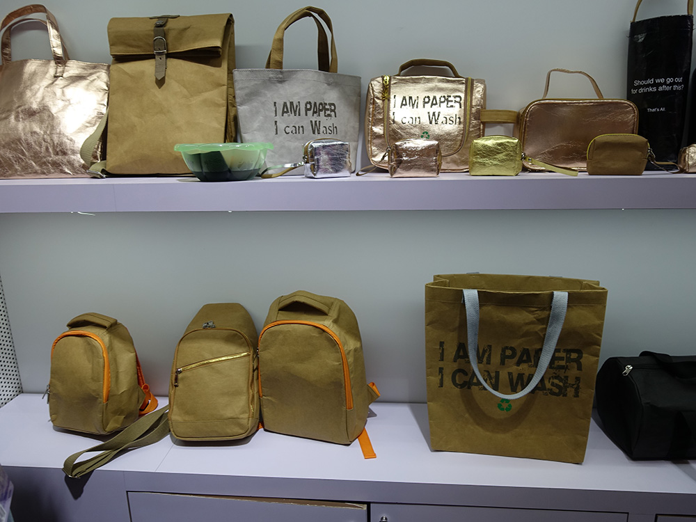 图:这系列手袋和背包全是用可回收纸製作的并可水洗\大公报记者卢静怡摄