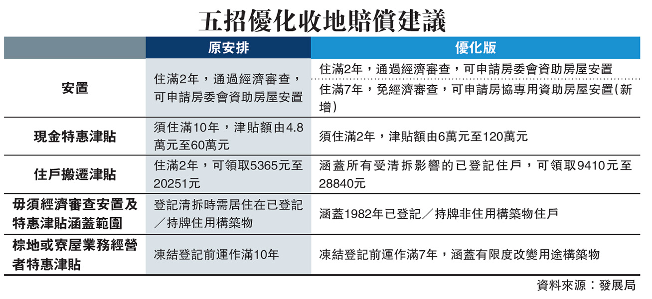 发展用地短缺,为加快清拆收地进度,政府宣布五招优化收地赔偿及安置方案。新安排下,在已登记寮屋包括由猪栏、储物室改建的劏房,住满七年可免经济审查,获安置到房协安置屋邨,若选择领取特惠津贴,申请资格的居住年期由10年放宽为两年,津贴上限则由60万元加码至120万元。发展局预计在新方案下,未来15至20年的新发展区涉及8000户,收地现金赔偿总额会增加2.4亿元至5.5亿元,横洲第一期发展受影响住户料率先受惠。\大公报记者 曾敏捷