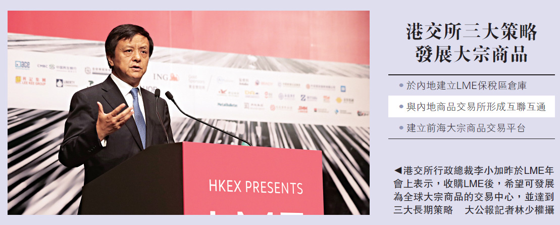 李小加昨于LME年会上指出,自港交所收购LME后,希望发展为全球大宗商品的交易中心,未来希望达到三大长期策略,包括于内地建立LME保税区仓库、与内地商品交易所形成互联互通,以及于前海建立大宗商品交易平台。但要达成三大目标需先取得内地监管机构的共识,相关工作仍在进行中,暂未有具体时间表可公布。