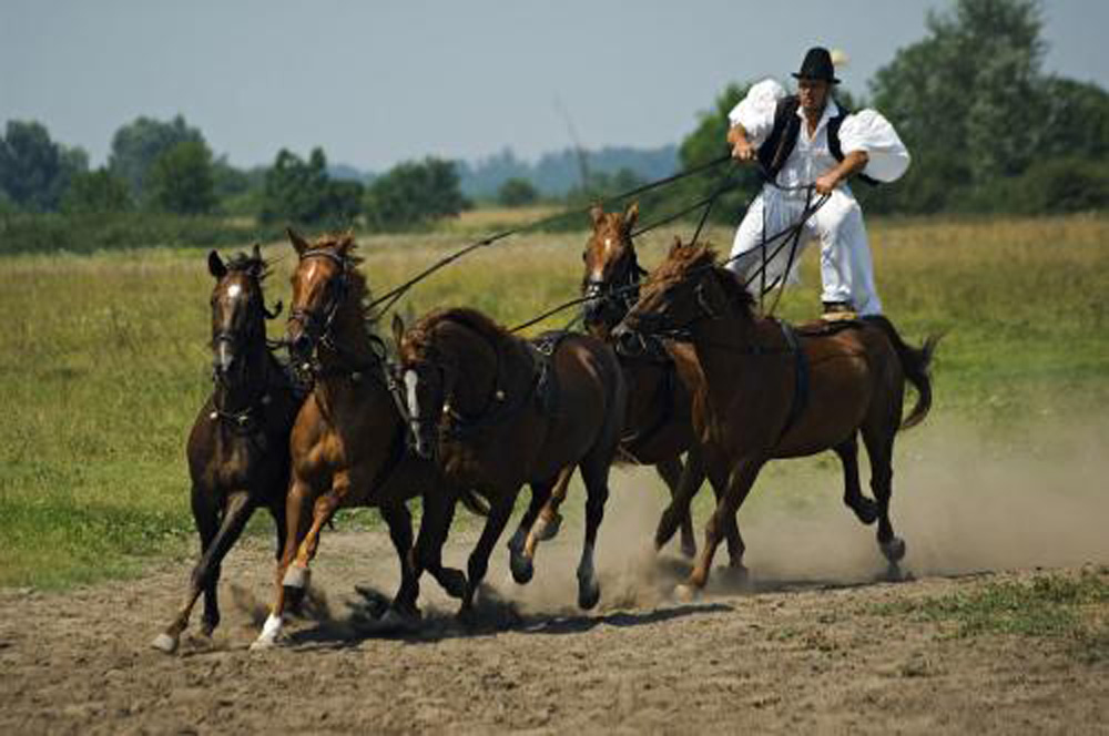 据另一位匈牙利问题专家周东耀介绍,匈牙利东北部的霍尔多巴吉大草原是这个国家良种马的驯养基地,有多个闻名遐迩的马术培训场所。无论匈牙利人还是外国人,总是抽闲到那里一试身手,挥上两鞭子,体验一下往昔金戈铁马生活的滋味。可惜,因时间关系,我无缘前往。但在布达佩斯西南方的巴拉顿湖区,我倒是看到另一种盛大而别致的赛马场景。一座有上万个座位的体育场内,男女老幼人山人海。一大帮年轻的骑手精神抖擞,英姿飒爽,牵着几十匹高头大马鱼贯入场。这里举行的不是一般的速度型赛马,而是别有一番景致的技艺表演赛。其中最引人注目的,一种是“一人驾驭多马赛”。一个骑手揽着五六匹马,号令一下,这些马一起奔跑。骑手从一匹马的脊背上,轮番跳到其他几匹马的脊背上,或坐或卧或站立,揽弓射箭。身段之轻盈,步履之稳健,射技之高超,令人惊悚不已。另一种是“多人骑马联赛”。三四个或五六个骑手一组,每人身跨一匹马,而所有马的腿部都用绳子联结在一起。一声令下,这些马同步齐奔,疾速如闪电,气势如排山倒海。还有一种是“多马拉车赛”。三四匹甚或五六匹不同毛色的高头大马并驾拉着一辆宽大的胶轮车,一个或几个驭手站在车的辕头,左手紧紧抓着繮绳,右手挥动皮鞭。号令枪一响,三四辆相同的马车起驾狂奔。在人们的欢呼声中,这些马车你追我赶,风驰电掣般滚滚向前。所有这些独特的赛马形式,据说均是模仿马扎尔人先祖骑马征战的雄伟场景,展现本民族自古就宣导的尚武精神。