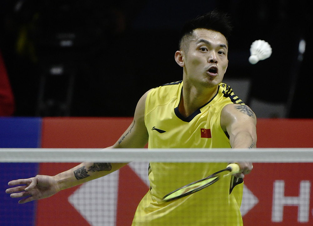 图:中国队男单选手林丹在比赛中回球 新华社