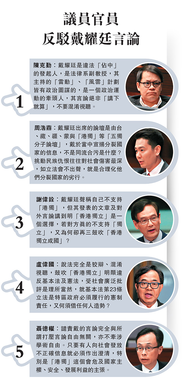 对于戴耀廷声称这是言论及学术自由,聂德权反驳指,“港独”绝对没有讨论空间,“香港享有言论自由,但若有人利用言论自由的空间钻空子,鼓动‘港独’理念,绝不能容忍和接受,发表自由权利时亦必须保障国家安全或公共秩序。”他重申,政府谴责戴耀廷的言论,完全与所谓打压言论自由无关,亦不牵涉学术自由,强调只要有人向社会发放不正确信息,政府必须作出澄清。