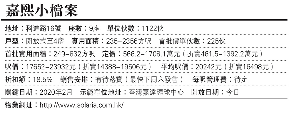 【大公报讯】记者梁颖贤报道:嘉华(00173)大埔白石角嘉熙,首批单位折实平均呎价近1.65万元,以贵绝大埔区新盘首批开价姿态出击。查实地皮于2015年9月以逾30亿元投得,每方呎楼面地价4567元,相隔三年,卖价比地价升近三倍。