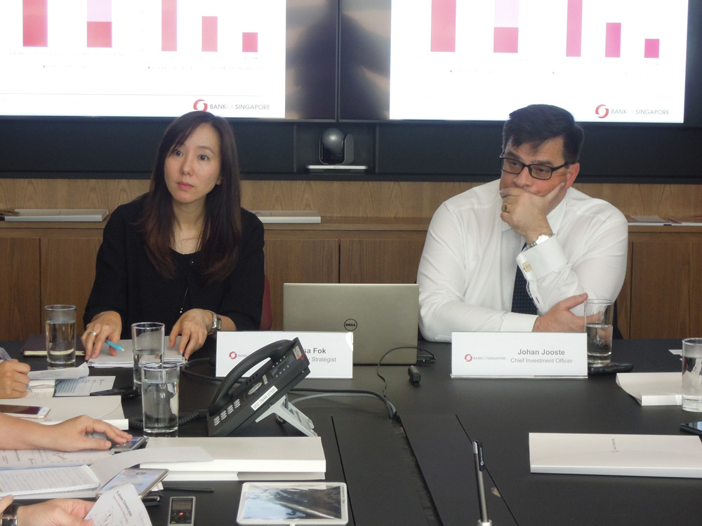 图:霍慧敏(左)看好教育板块龙头。旁为新加坡银行首席投资总监蒋瀚洋(右)\大公报记者刘鑛豪摄