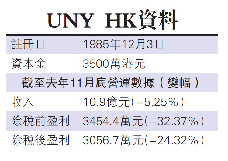 UNY HK截至去年11月底之年度收入约10.9亿元,按年跌5.25%,除税前盈利3454.4万元,按年跌32.37%,除税后盈利3056.7万元,按年跌24.32%。