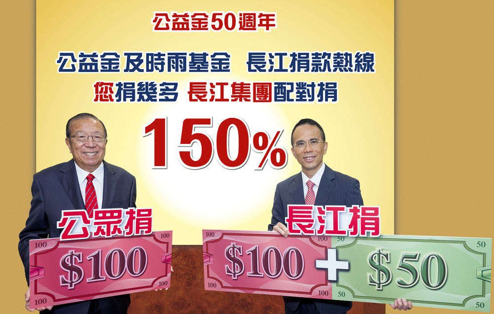 已连续十八年荣膺公益金三大最高筹款机构之一的长江集团,继去年以120%加码比例配对公众捐款后,今年适逢香港公益金迈向50周年,长江集团把配对比例进一步加码提升至150%,以鼓励公众捐款。
