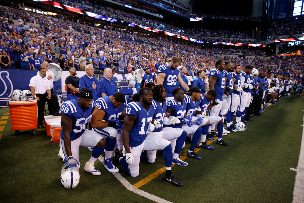 图:2017年9月,印第安纳小马队球员在奏国歌时半跪\料图片