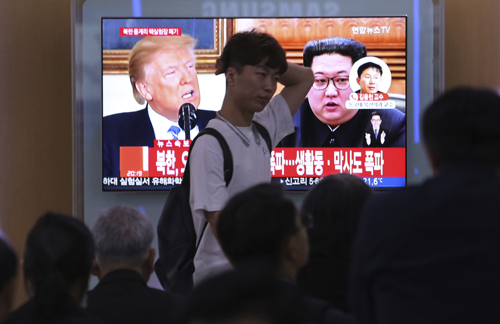 图:韩国民众观看媒体24日报道美朝峰会消息\美联社