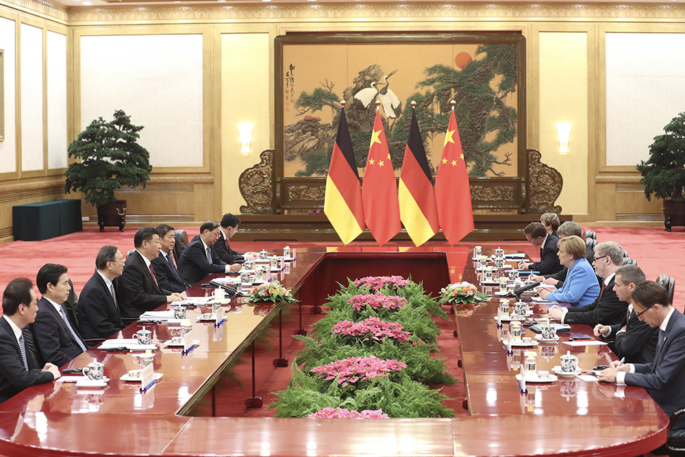 图:在会晤中,习近平表示中方愿同德方共同努力,推动双边关系不断迈上新高度\中新社