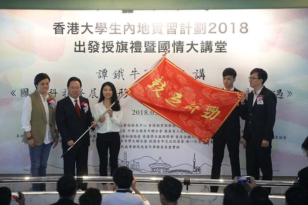 由香港文化艺术发展中心主办的“香港大学生内地实习计划2018”,昨日举行出发授旗礼,约500名参与计划的学生出席,并邀请中联办副主任谭铁牛担任主礼嘉宾。香港文化艺术发展中心执行董事王耀莹致辞时称,不少实习回来的学生都对内地的科技发展表示赞嘆,部分人更习惯了内地的便捷生活,回到香港反而不适应。他希望学生在机构学习之馀,同时思考自己在国家发展大局中可以担当什么角色。