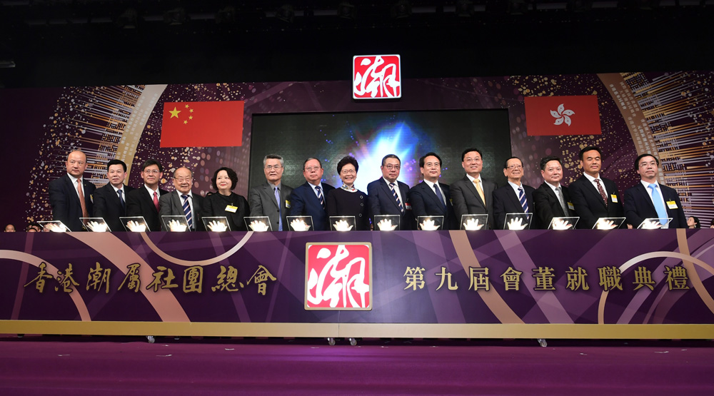 香港潮属社团总会(潮总)日前举行第九届会董就职典礼。主礼嘉宾有行政长官林郑月娥,中共中央统战部副部长谭天星,外交部驻港特派员公署特派员谢锋,中联办副主任黄兰发,广东省委统战部副部长李焕春等。林郑月娥赞扬潮总支持特区施政,推动香港繁荣稳定。/大公报记者 龚学鸣