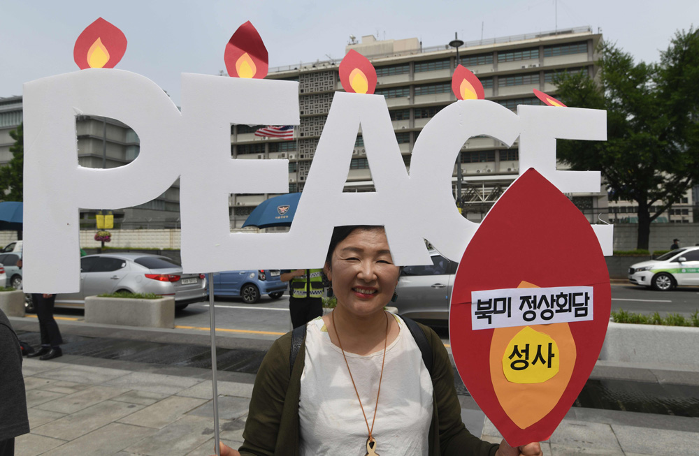 韩国人25日在美国驻首尔大使馆前呼吁“和平”法新社