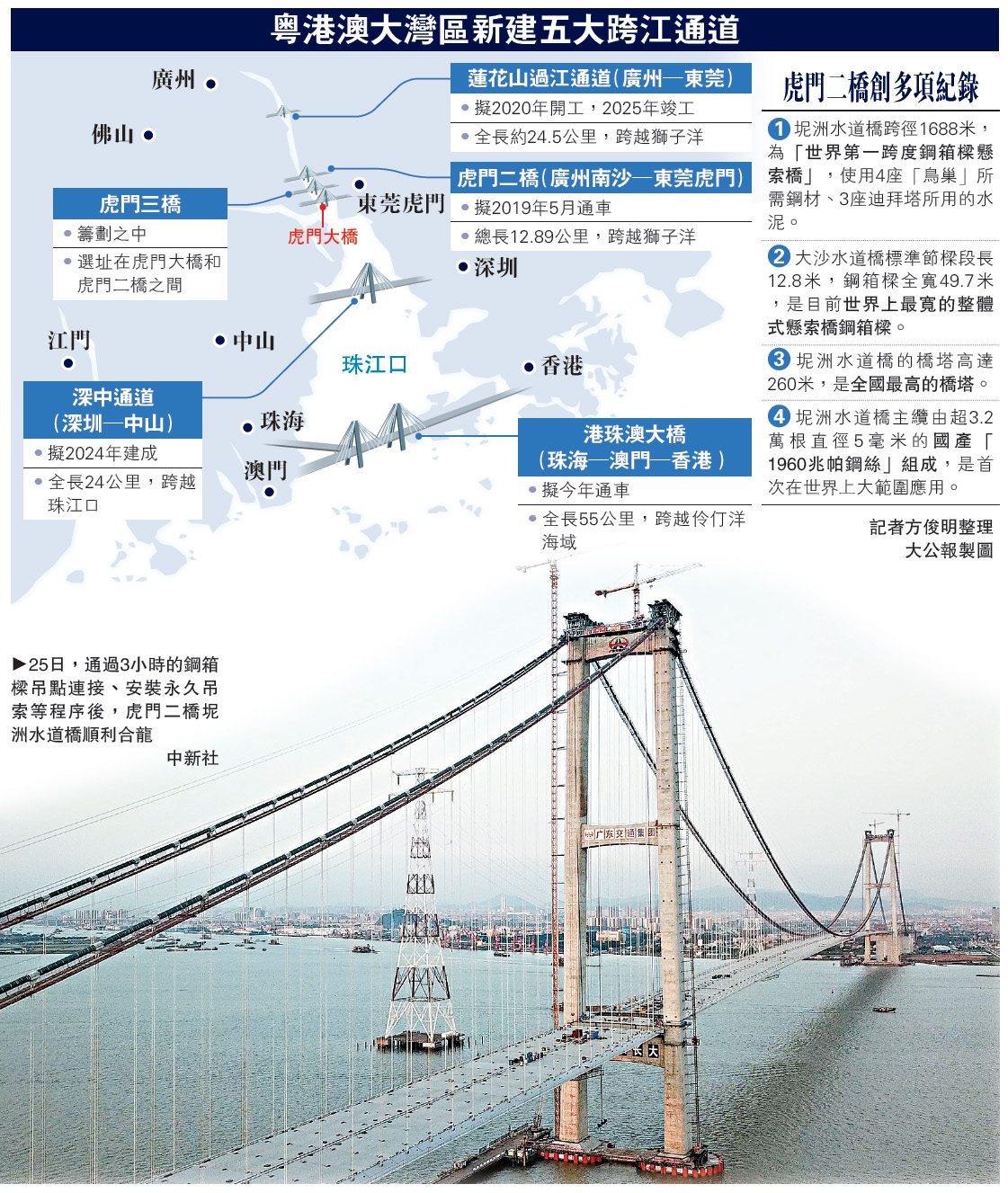 作为粤港澳大湾区的重要交通枢纽,虎门二桥横跨珠江东西岸,继主跨1200米的大沙水道桥之后,被誉为“世界第一跨度钢箱樑悬索桥”跨径达1688米的坭洲水道桥25日亦顺利合龙,拟明年5月建成通车。届时,从广州到东莞的路程可缩短10公里,比现在缩短约半小时车程,大大降低珠江东西岸运输成本,促进大湾区城市间人流、物流等快速流动,将携手港珠澳大桥、深中通道等跨江枢纽,形成粤港澳大湾区内“一小时城城达”。/大公报记者 方俊明广州报道