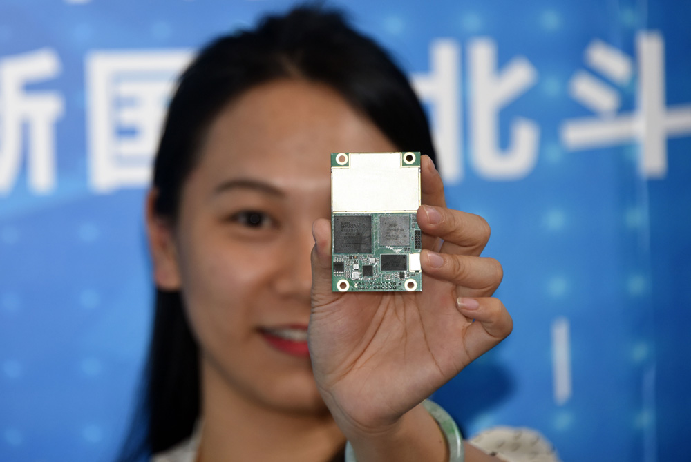 卫星导航技术与应用成果展上,广州中海达卫星导航技术股份有限公司的工作人员向媒体展示“恆星一号”北斗芯片。该芯片为国内自主研发、具完全自主知识产权的北斗射频芯片。