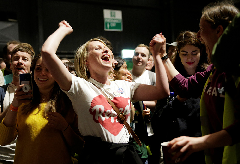 图:支持堕胎合法化的选民25日在都柏林票站,庆祝即将到来的胜利 路透社