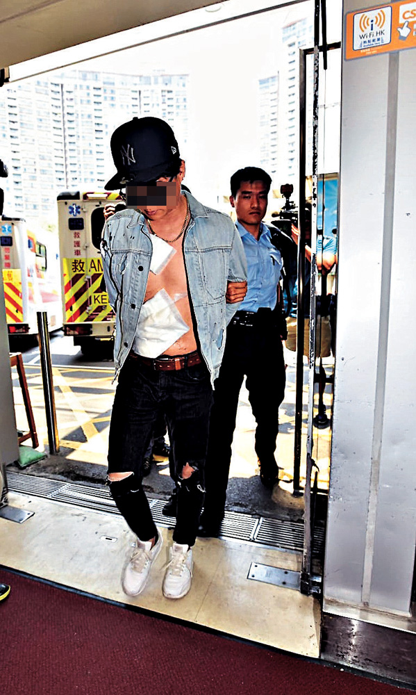 图:躁夫逞兇后并没逃走,双手和胸部亦受伤,由警员羁押送院。圆图为装着腐液的樽