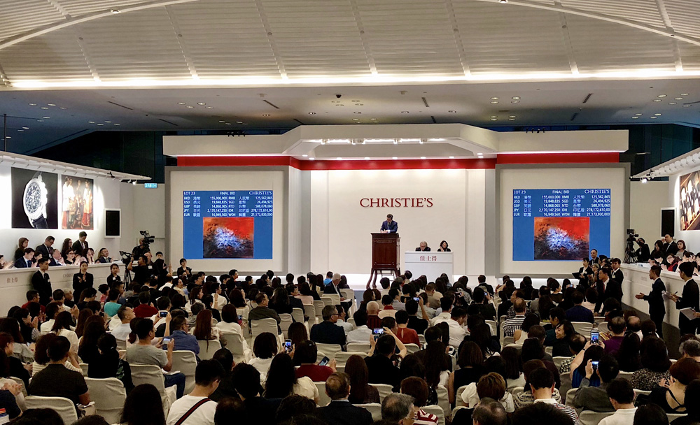 正于香港会展中心举行的佳士得香港二○一八年春季拍卖,艺术部分重头戏“亚洲二十世纪及当代艺术/融艺”晚间拍卖前日(5月26日)下午六时举槌。除了名和晃平《PixCell:鹿 第29号》(Lot 45)即场宣布撤拍,本场共计上拍作品七十六件,其中二十三件逾千万港元成交,赵无极一九五九年油画《14.12.59》(Lot 23)以1.76亿港元成交额称冠(成交额均含佣金,下同),成为拍场上第三贵的赵无极作品(最贵为《29.01.64》,成交价2.03亿港元;其次是《大地无形》成交价1.83亿港元)。