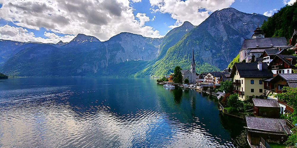 哈修塔特小镇位于上奥地利省、阿尔卑斯山脉东部的达赫斯坦山脚下。下了火车还需要搭乘一小段轮渡,小船驶过宁静光亮的哈修塔特湖面,驶向这个被群山环绕、湖水环抱、就如木纹首饰盒中的各色宝石般精美的小镇,驶进这张无噪点、超高清画质的风景“明信片”。
