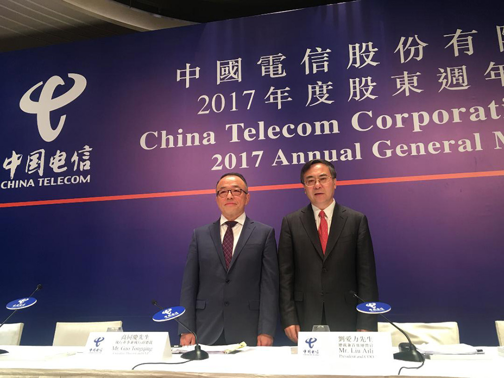 图:中电信总裁兼首席运营官刘爱力(右)及执行副总裁高同庆 大公报记者李洁仪摄