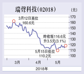 瑞声科技(02018)于3月中高见163.6元后反覆下挫至本月低位107.6元,跌幅超过三成,若以现水平计,跌幅亦接近三成。不过,从走势来看,短线似有喘定迹象,现水平开好仓博反弹值博率甚高。