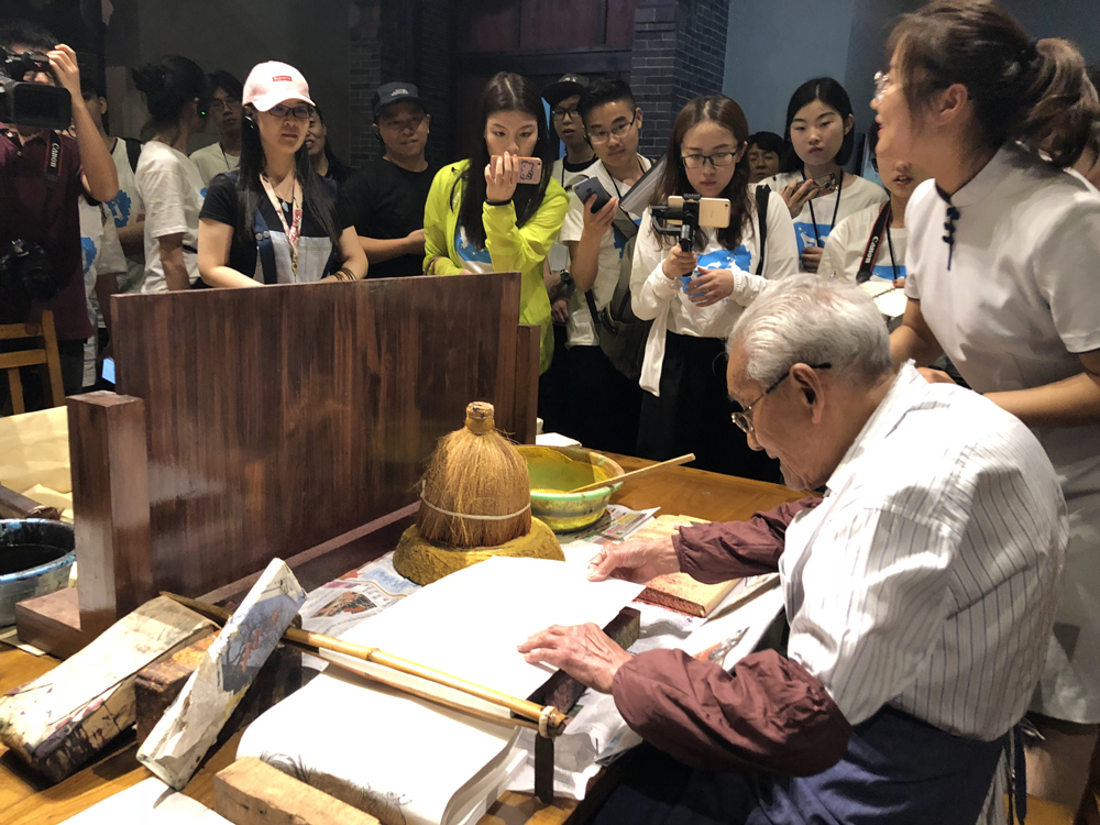 现场製作木版年画,欣赏精美绝伦的汴绣,体验大宋官瓷製作,漫游古都老字号……6月14日,“2018范长江行动──中原行”香港传媒学子一行走进开封文化客厅以及开封博物馆,与多名非遗传承人零距离接触,感受工艺大师的精湛技艺和高超水平。当中,他们更採访了学艺八十载、现年93岁的首批国家级非物质文化遗产朱仙镇木版年画的传承人郭太运,聆听大师细诉近现代朱仙镇木版年画的荣衰转变。大公报实习记者 钟一鸣、张瑞洋开封报道
